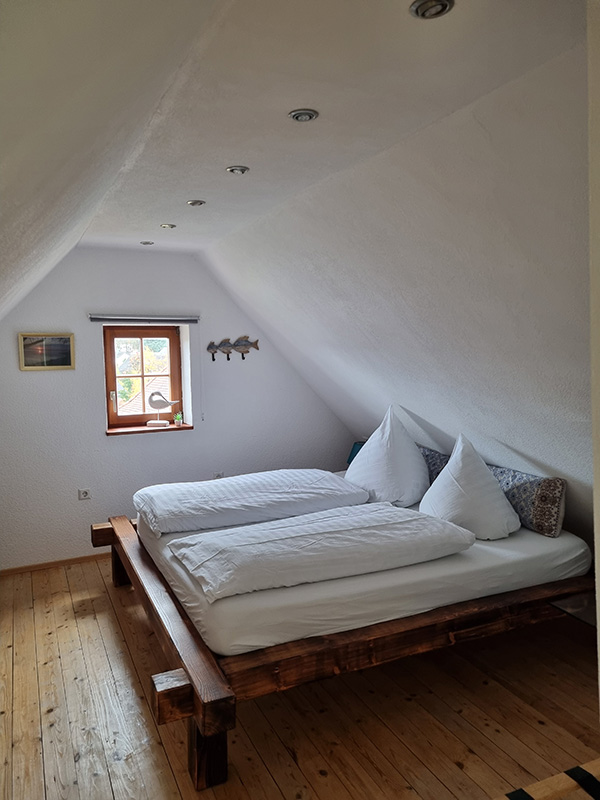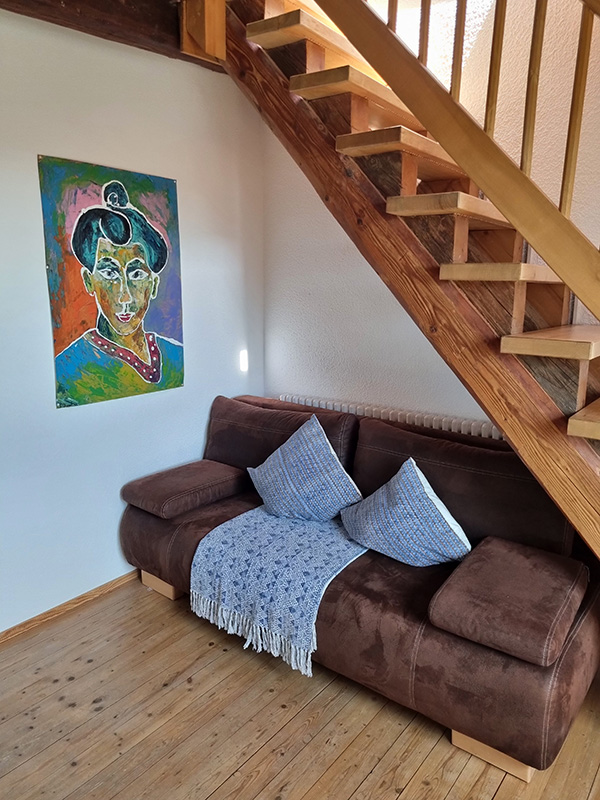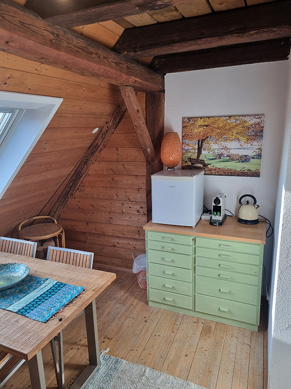 Unser 80 qm Maisonette-Apartment liegt im 2.OG + DG über zwei Ebenen mit traumhaftem Blick auf den Bodensee und die Voralpen.